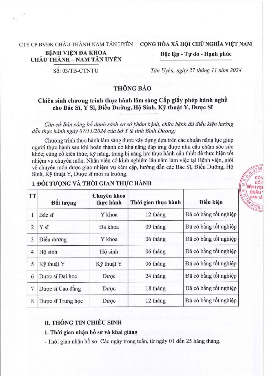 THÔNG BÁO CHIÊU SINH CHƯƠNG TRÌNH THỰC HÀNH.